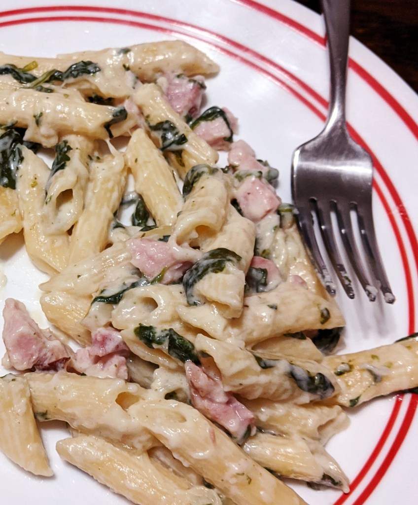 - Add half&half (or milk) and chicken broth all at once. Cook and whisk till bubbly then cook for 1 minute more. Stir in pasta, spinach and ham.
